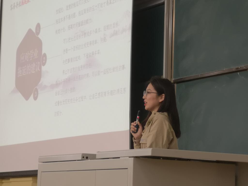最后,金老师向同学们介绍了有关拖延症的知识,尤其是学业拖延。学业拖延会令人对预期内要完成的学习任务的自愿延迟,即使知道这种延迟会带来不良后果,且在延迟的过程中个体会经历焦虑、抑郁、愧疚等负性情绪。老师督促大家不要因为拖延浪费了大好青春时光,避免被拖延绊住前进的脚步。之后,老师放了一段关于拖延症的脱口秀视频,让同学们在愉快的氛围中,牢记拖延的危害。