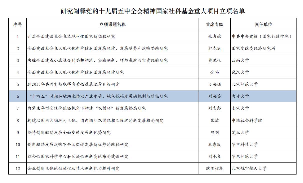 近日,我院刘海英教授担任首席专家申报的《“十四五”时期环境约束推动产业平稳、绿色低碳发展的机制与路径研究》获批研究阐释党的十九届五中全会精神国家社科基金重大项目招标立项。这是刘海英教授继2015年获批《十三五”时期环境治理与经济发展方式转变相互协调机制研究》国家社科基金重大项目后,第二次承担国家级重大项目。