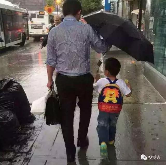 在美国纽约皇后区的马路上,一位父亲为孩子打着伞,自己的后背却被雨水淋透了。