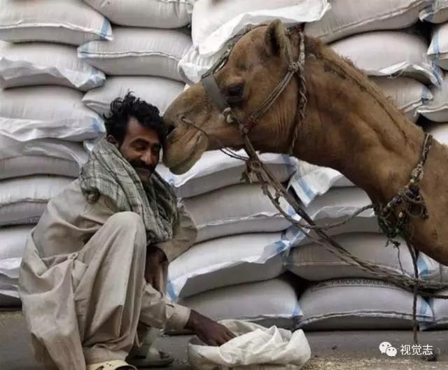 巴基斯坦,一头骆驼亲吻给自己喂食的主人。